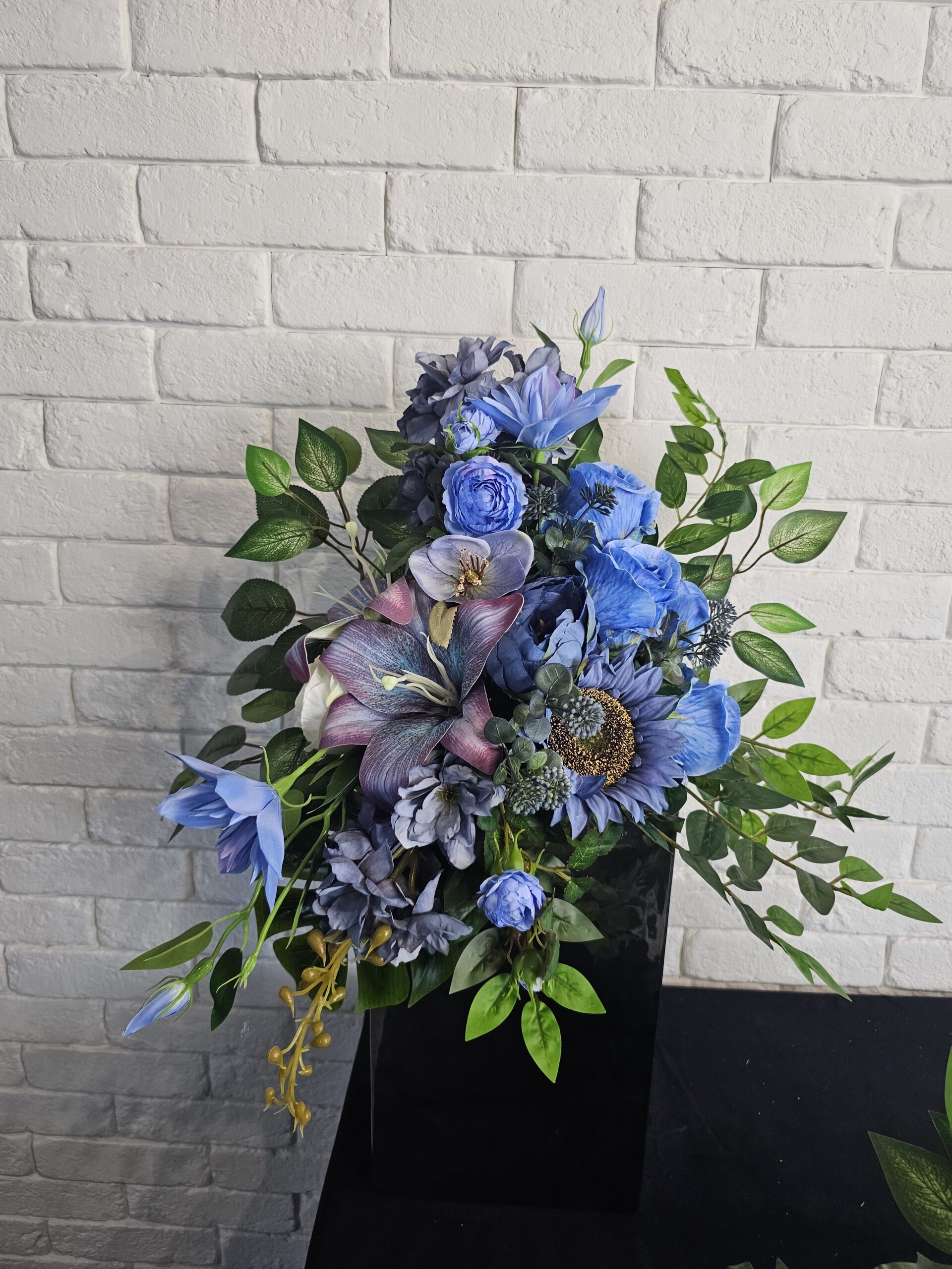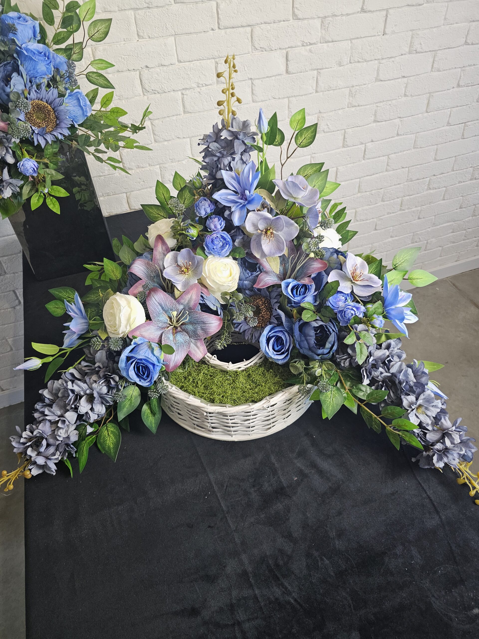Kompozycja nagrobna obciążona w białym wiklinowym koszu w niebieskie kwiaty w komplecie tj. wiązanka z bukietem, wymiary: 70cm(długość) x 70cm(szerokość) x 50cm(wysokość).