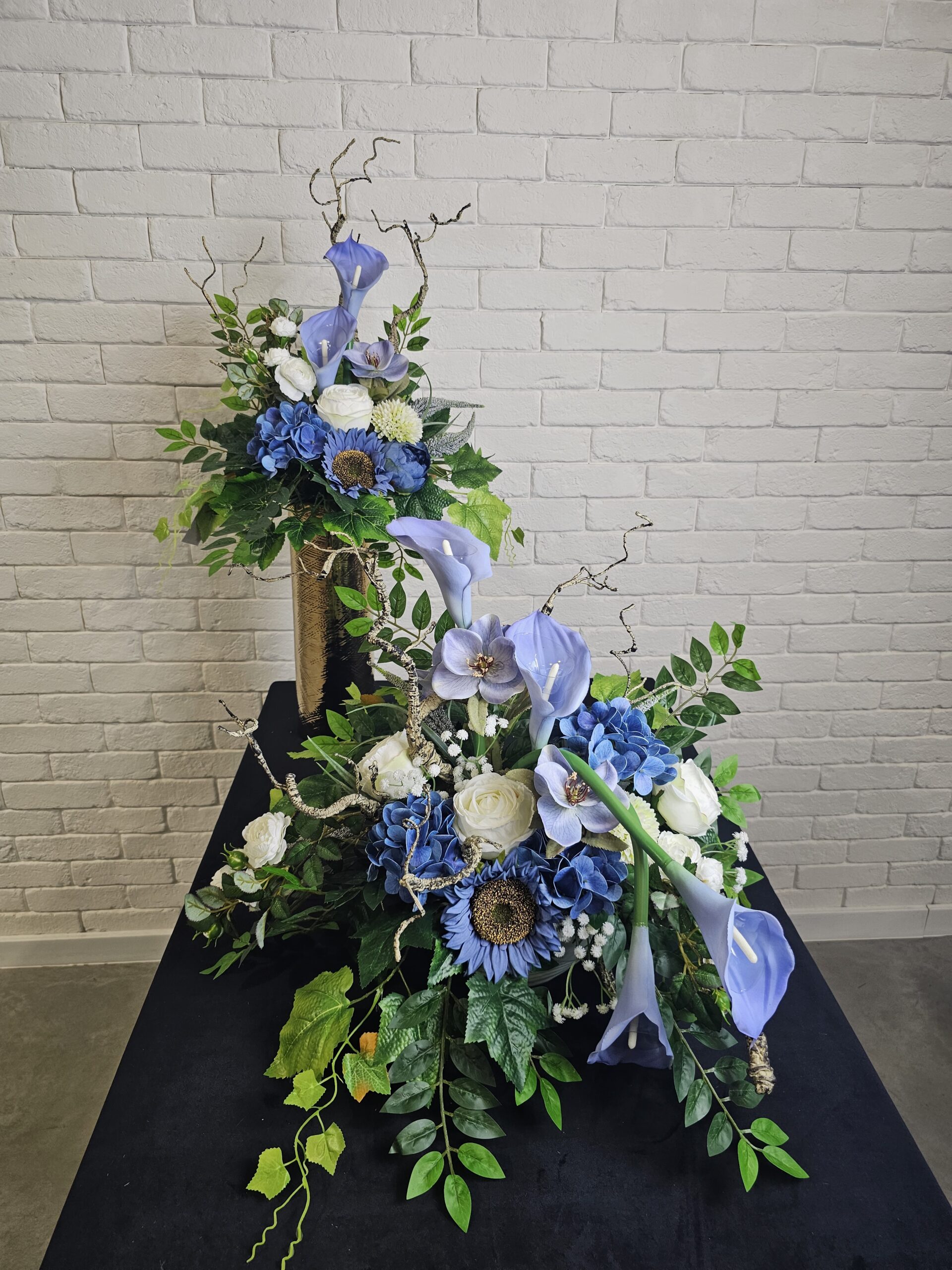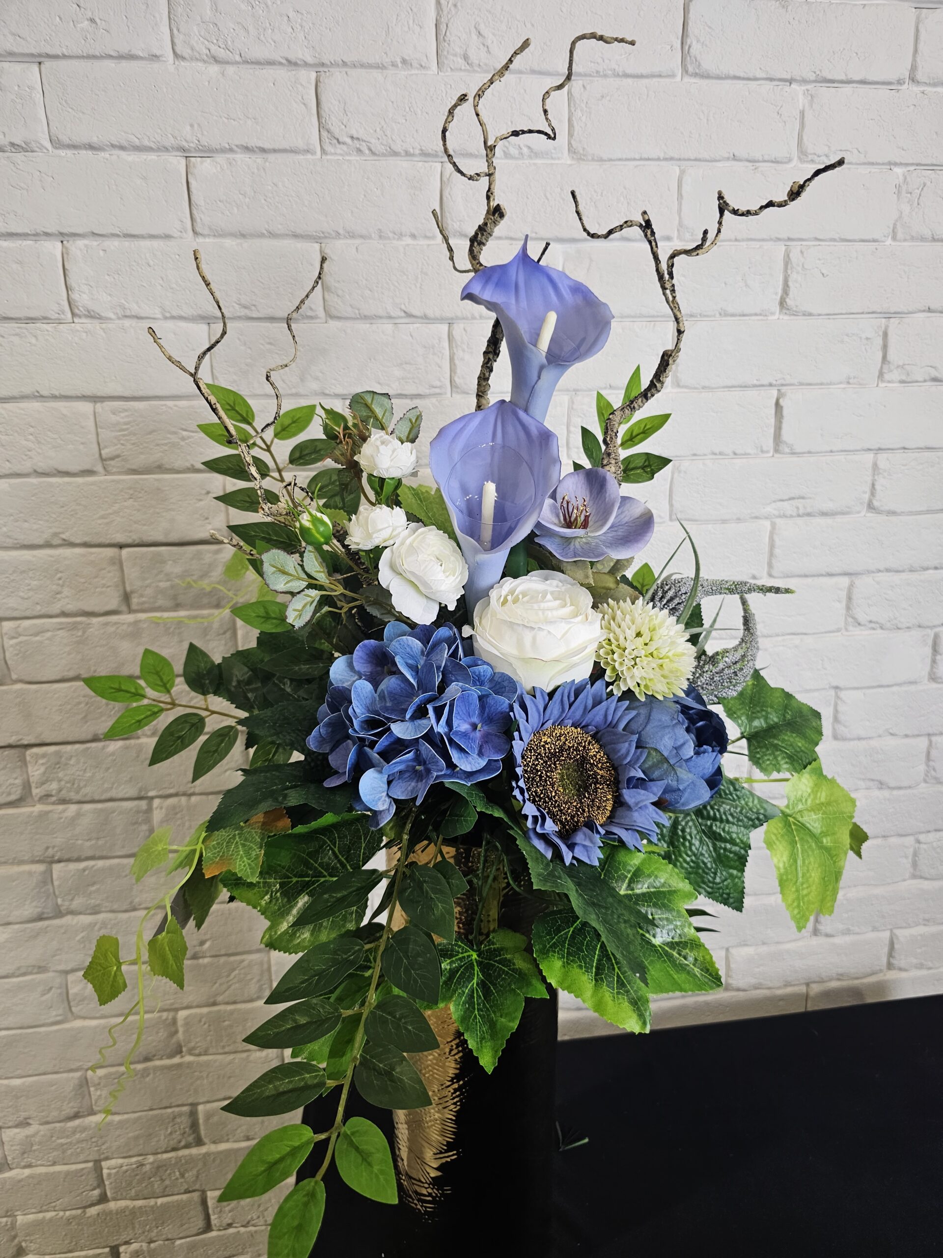 Kompozycja nagrobna obciążona na białej donicy z niebieską kalią w komplecie tj. wiązanka z bukietem.