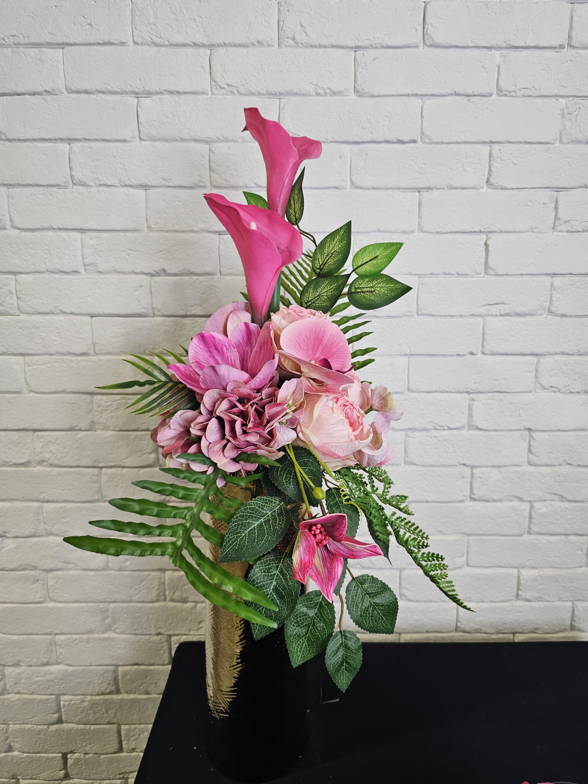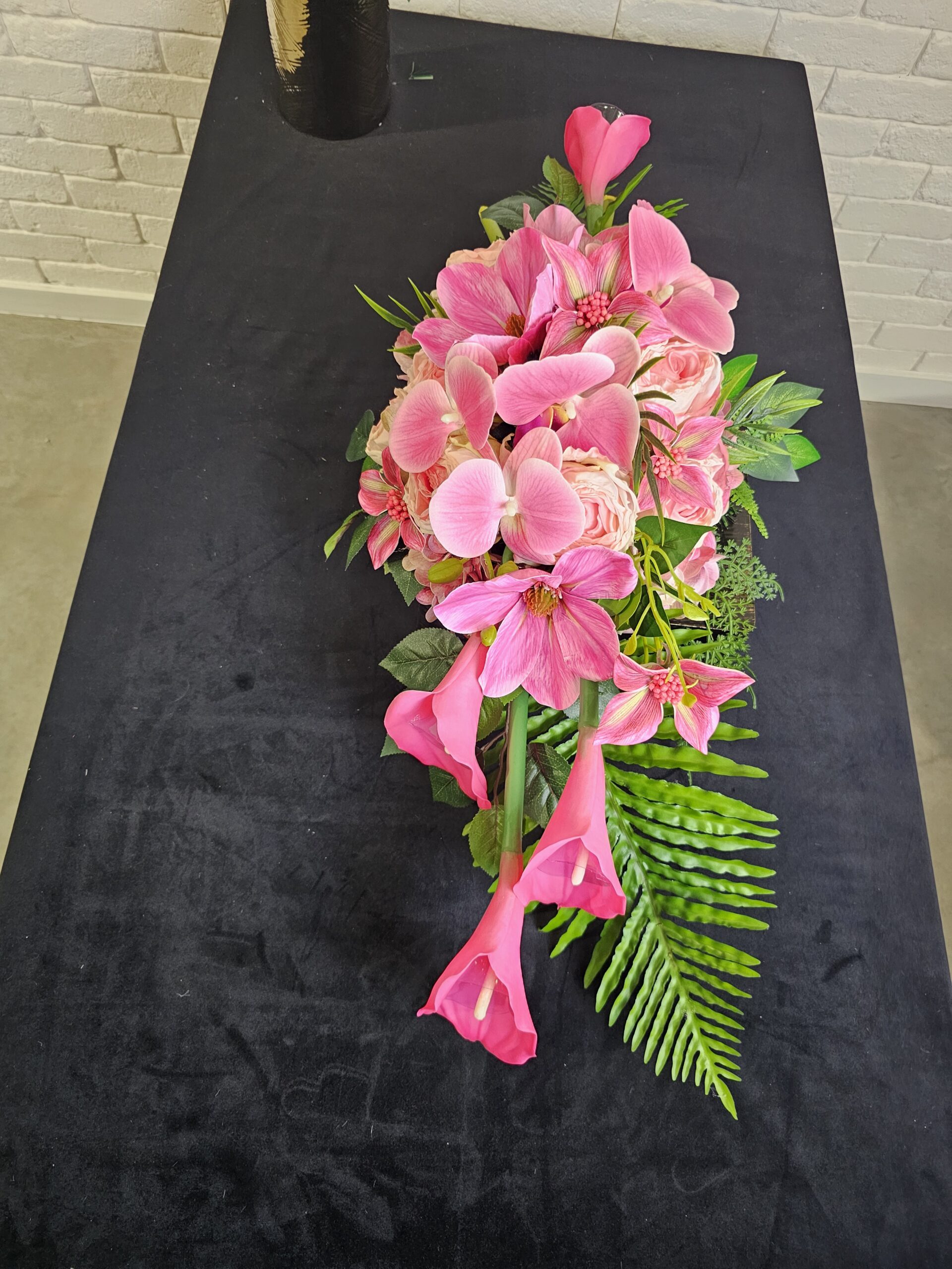 Kompozycja nagrobna obciążona z różową kalią i storczykiem w komplecie tj. wiązanka z bukietem, wymiary: 75cm(długość) x 25cm(szerokość).