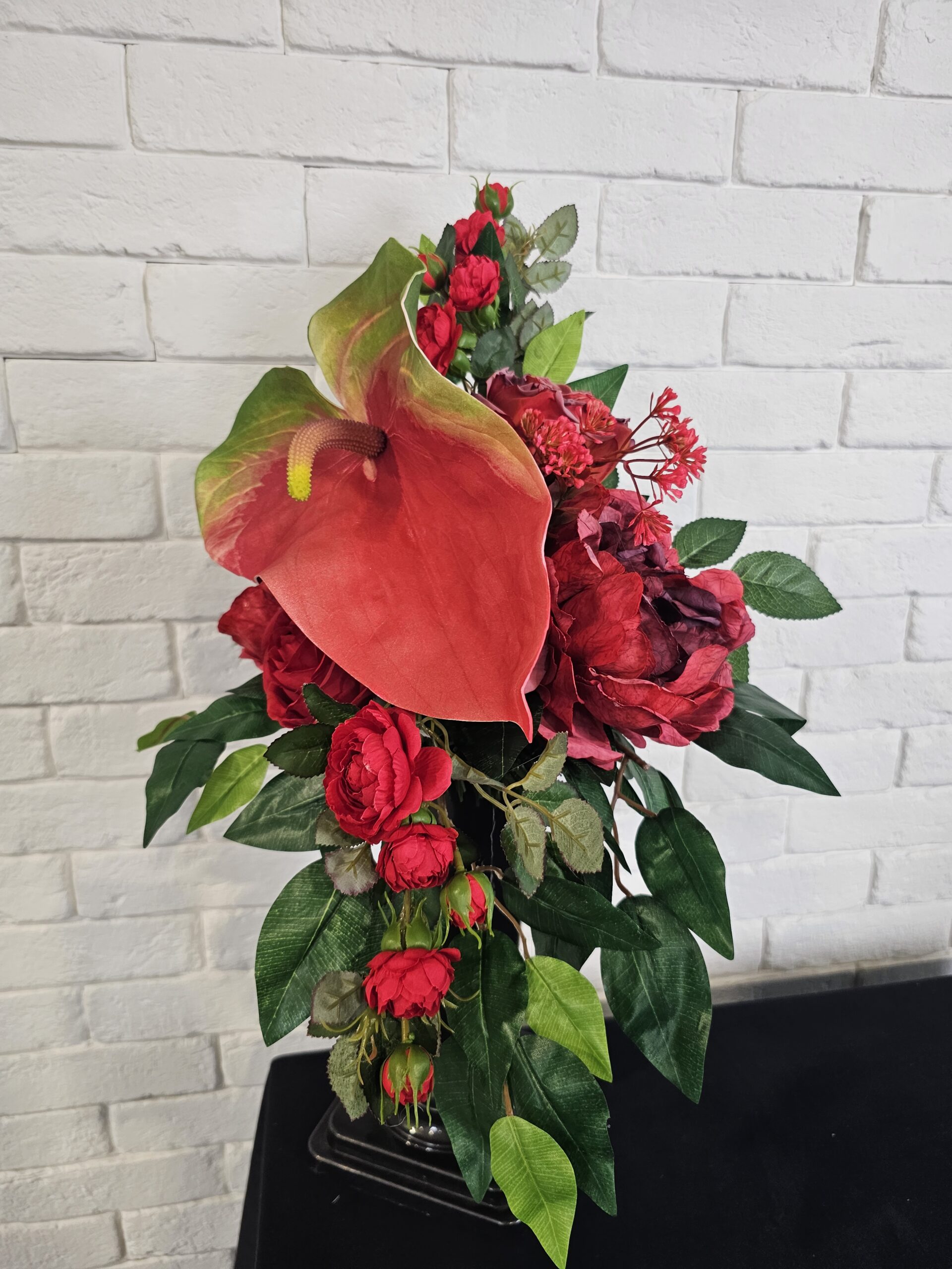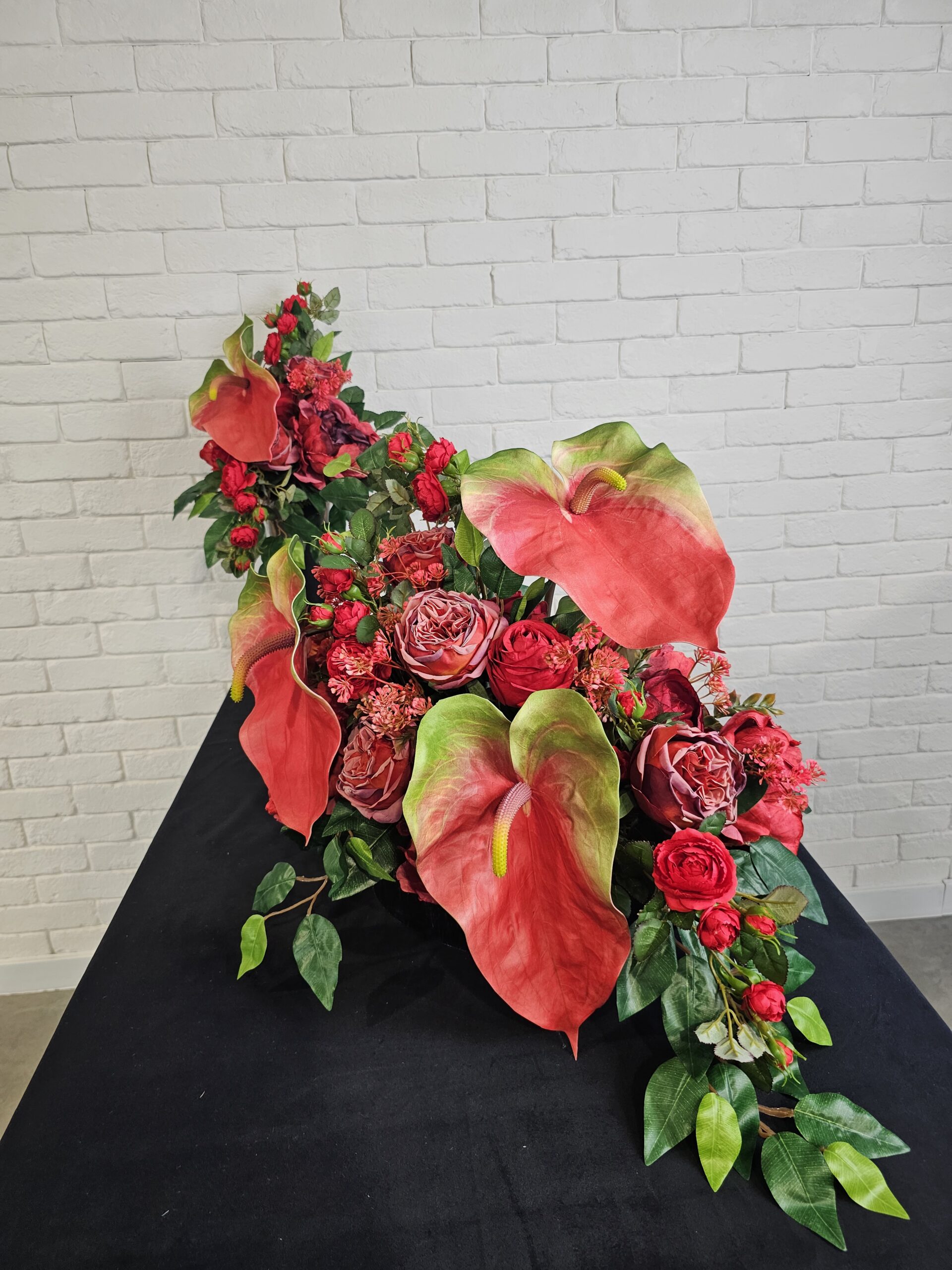 Kompozycja nagrobna obciążona z dużym czerwonym anturium i paloną różą w komplecie tj. wiązanka z bukietem, wymiary: 50cm(długość) x 35cm(szerokość) x 40cm(wysokość).