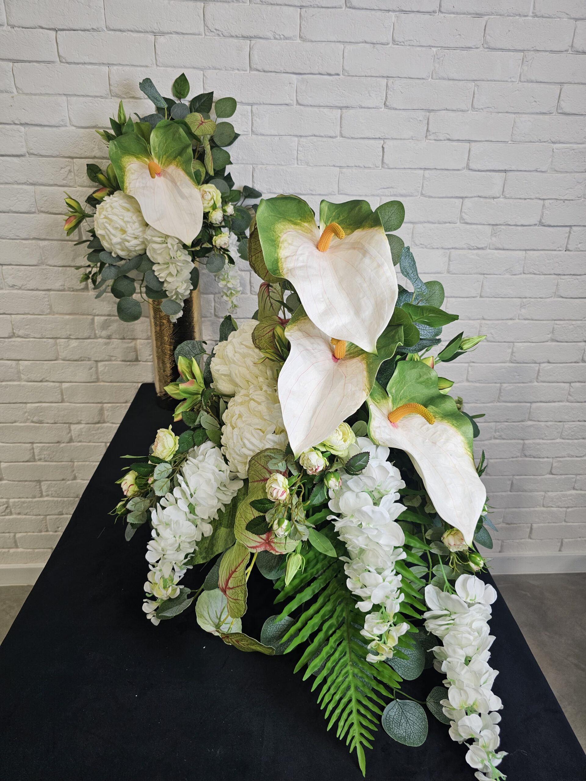 Kompozycja nagrobna obciążona z białym dużym anturium i wiszącą wisterią w komplecie tj. wiązanka z bukietem, wymiary: 50cm(długość) x 45cm(szerokość) x 50cm(wysokość). Wysyłka DPD za przedpłatą 25zł.