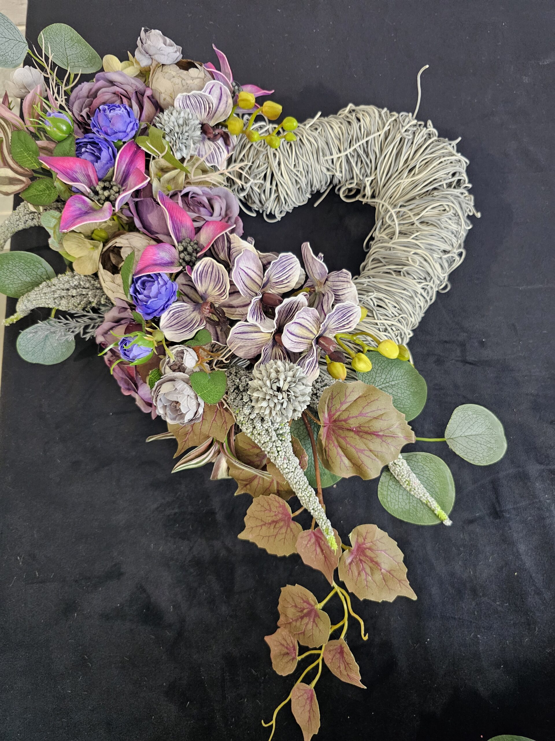Serce z szarej żyłki z fioletowymi kwiatami, wymiary: 50cm(długość) x 40cm(szerokość). Wysyłka DPD za przedpłatą 25zł.