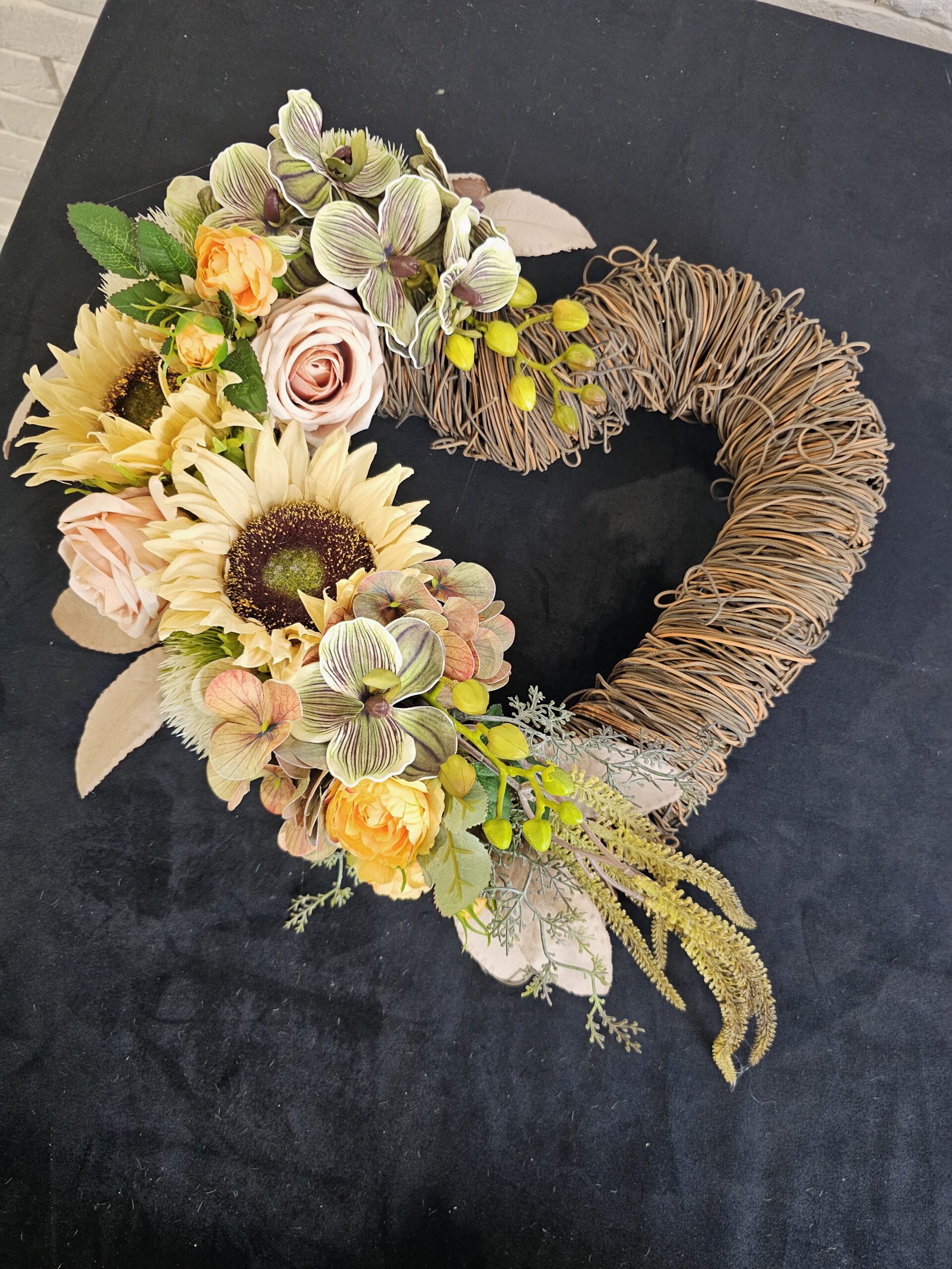 Serce z brązowej żyłki z jasnymi kwiatami, wymiary: 40cm(długość) x 40cm(szerokość). Wysyłka DPD za przedpłatą 25zł.