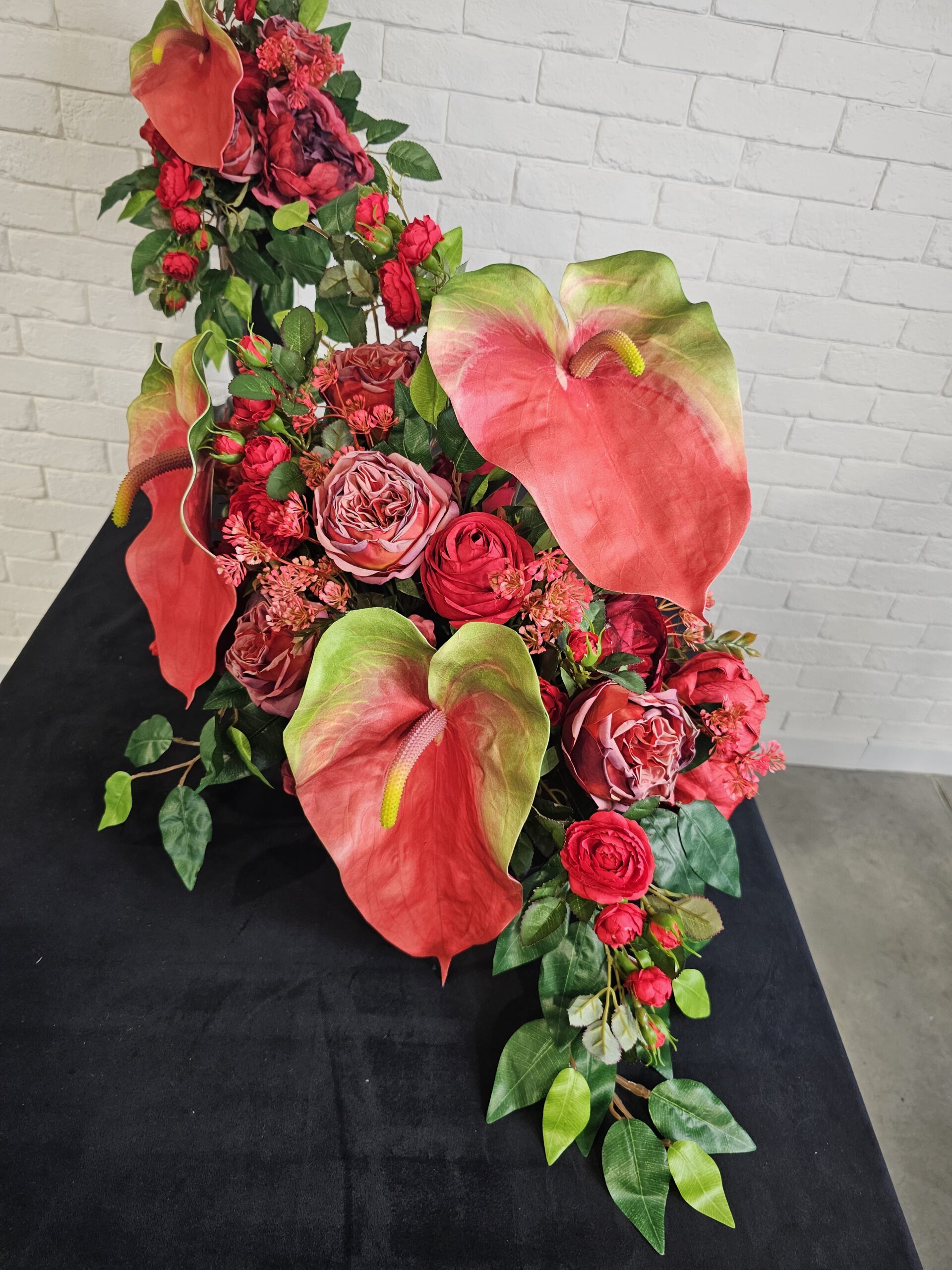 Kompozycja nagrobna obciążona z dużym czerwonym anturium i paloną różą w komplecie tj. wiązanka z bukietem, wymiary: 50cm(długość) x 35cm(szerokość) x 40cm(wysokość). Wysyłka DPD za przedpłatą 25zł.