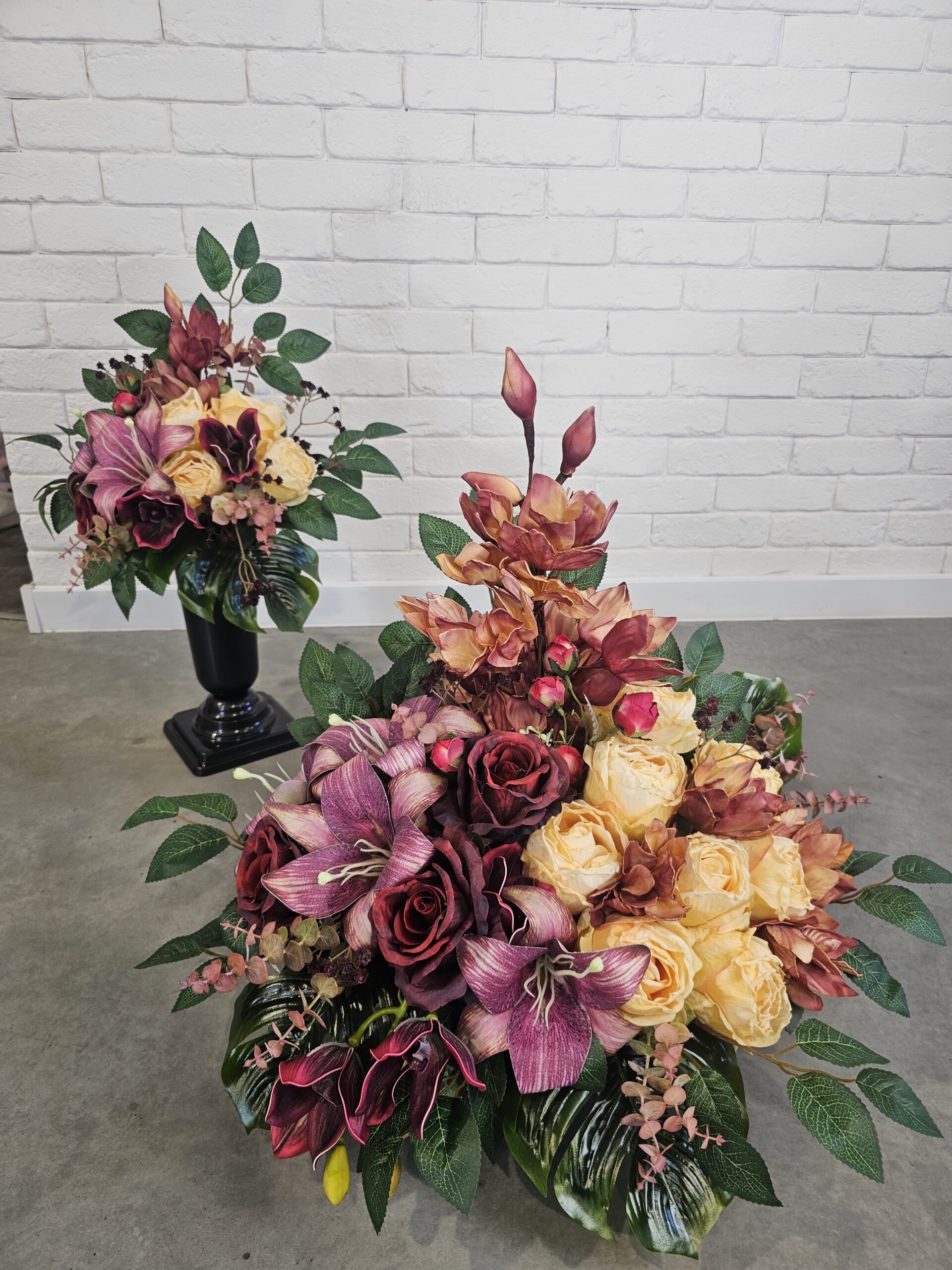 Kompozycja nagrobna obciążona, bordowe i budyniowe kwiaty w komplecie tj. wiązanka z bukietem, wymiary: 55cm(długość) x 35cm(szerokość) x 55cm(wysokość). Wysyłka DPD za przedpłatą 25zł.