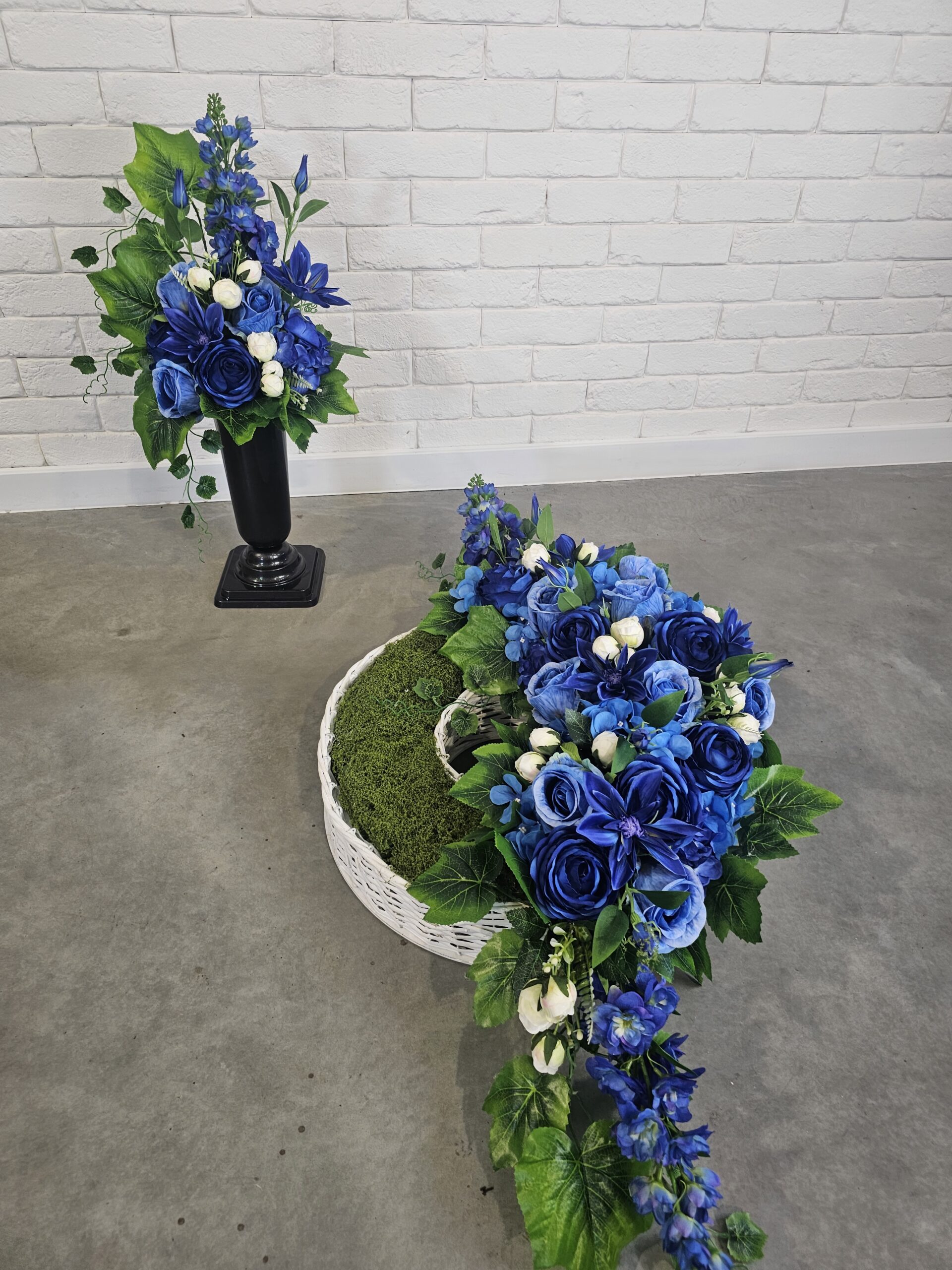 Kompozycja nagrobna obciążona na białym wiklinowym kole, w granatowe kwiaty, w komplecie tj. wiązanka z bukietem, wymiary: 100cm(długość) x 45cm(szerokość). Wysyłka DPD za przedpłatą 25zł.