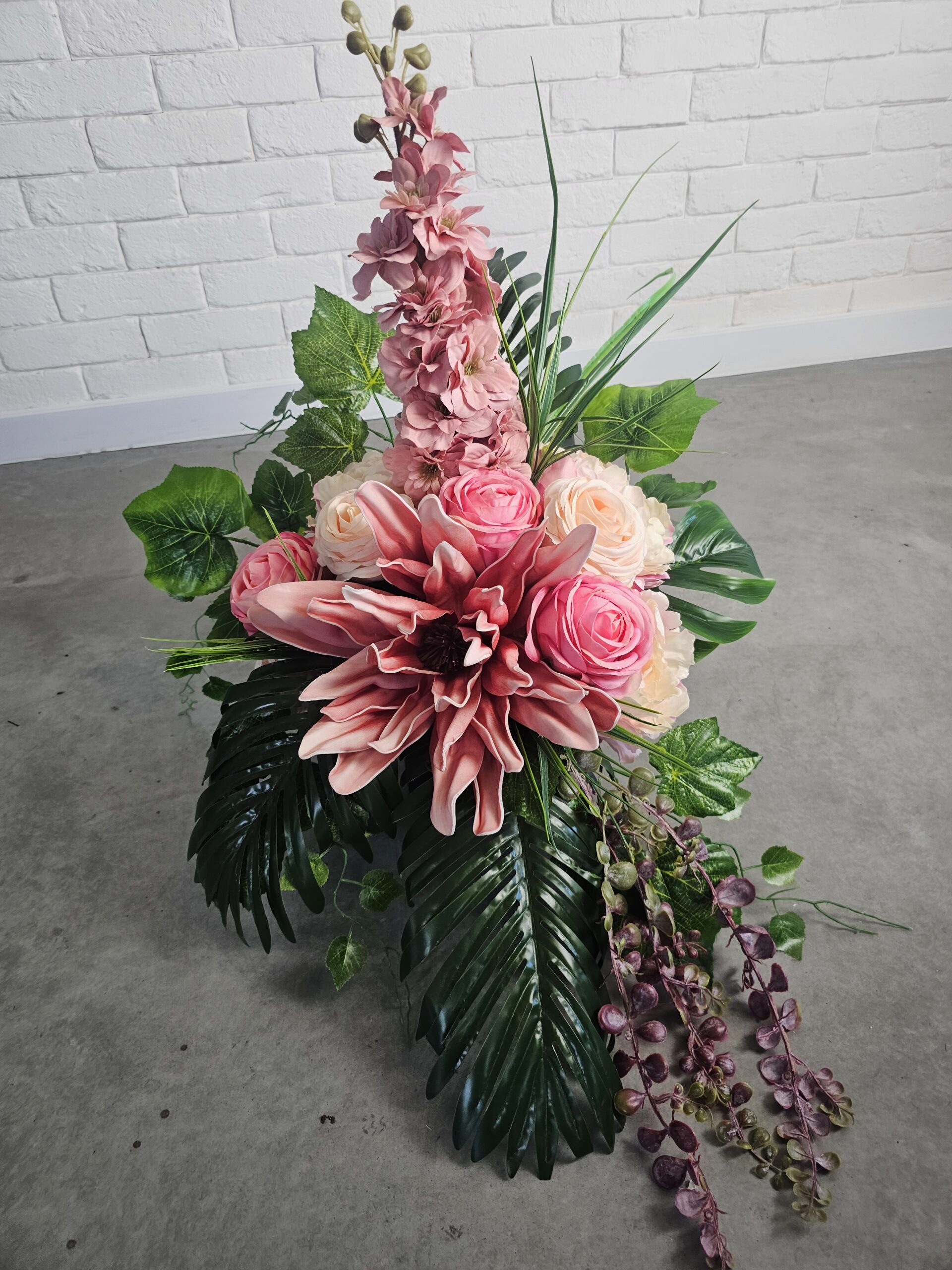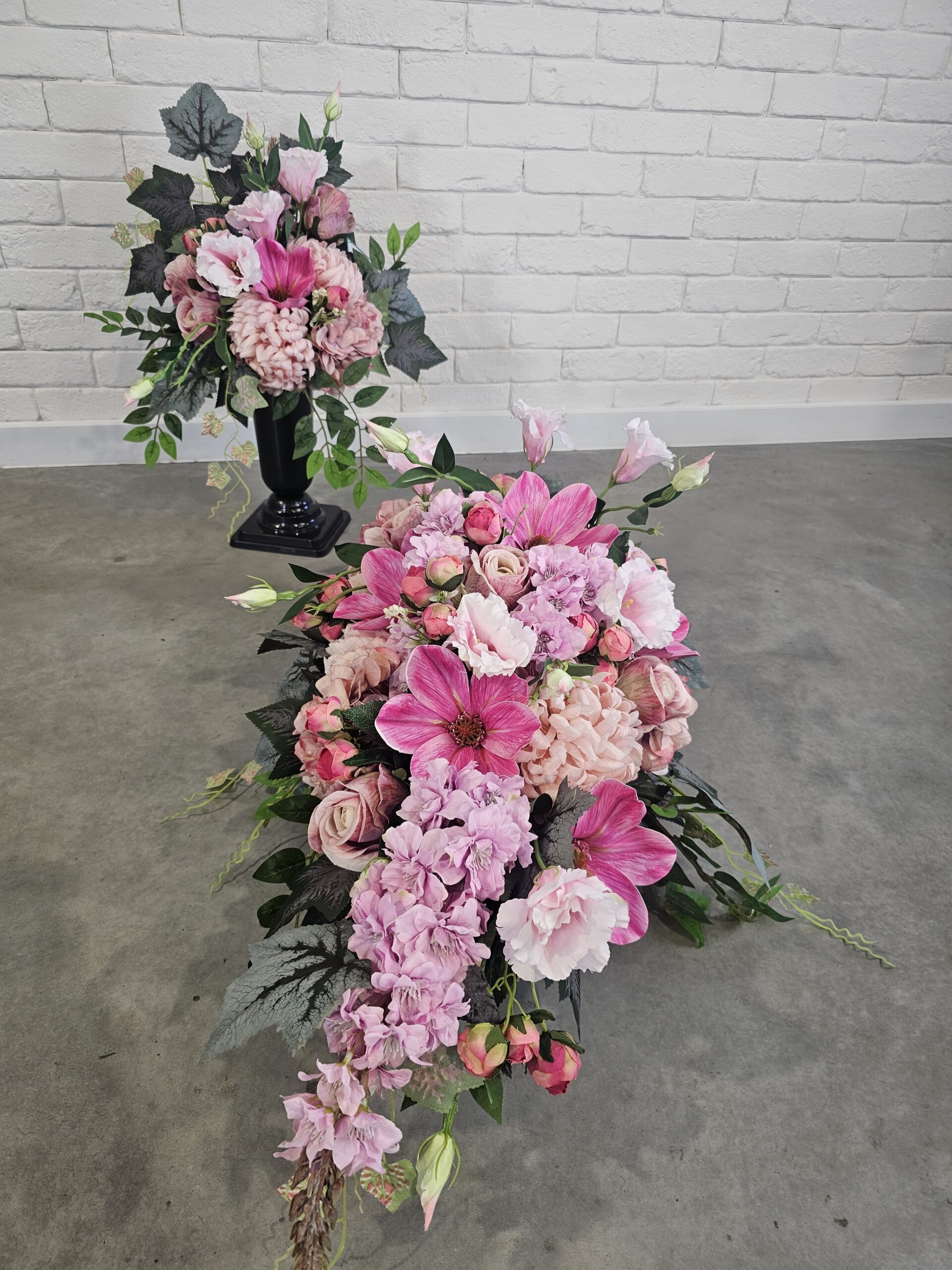 Kompozycja nagrobna obciążona z różową magnolią w komplecie tj. wiązanka z bukietem, wymiary: 80cm(długość) x 40cm(szerokość). Wysyłka DPD za przedpłatą 25zł.