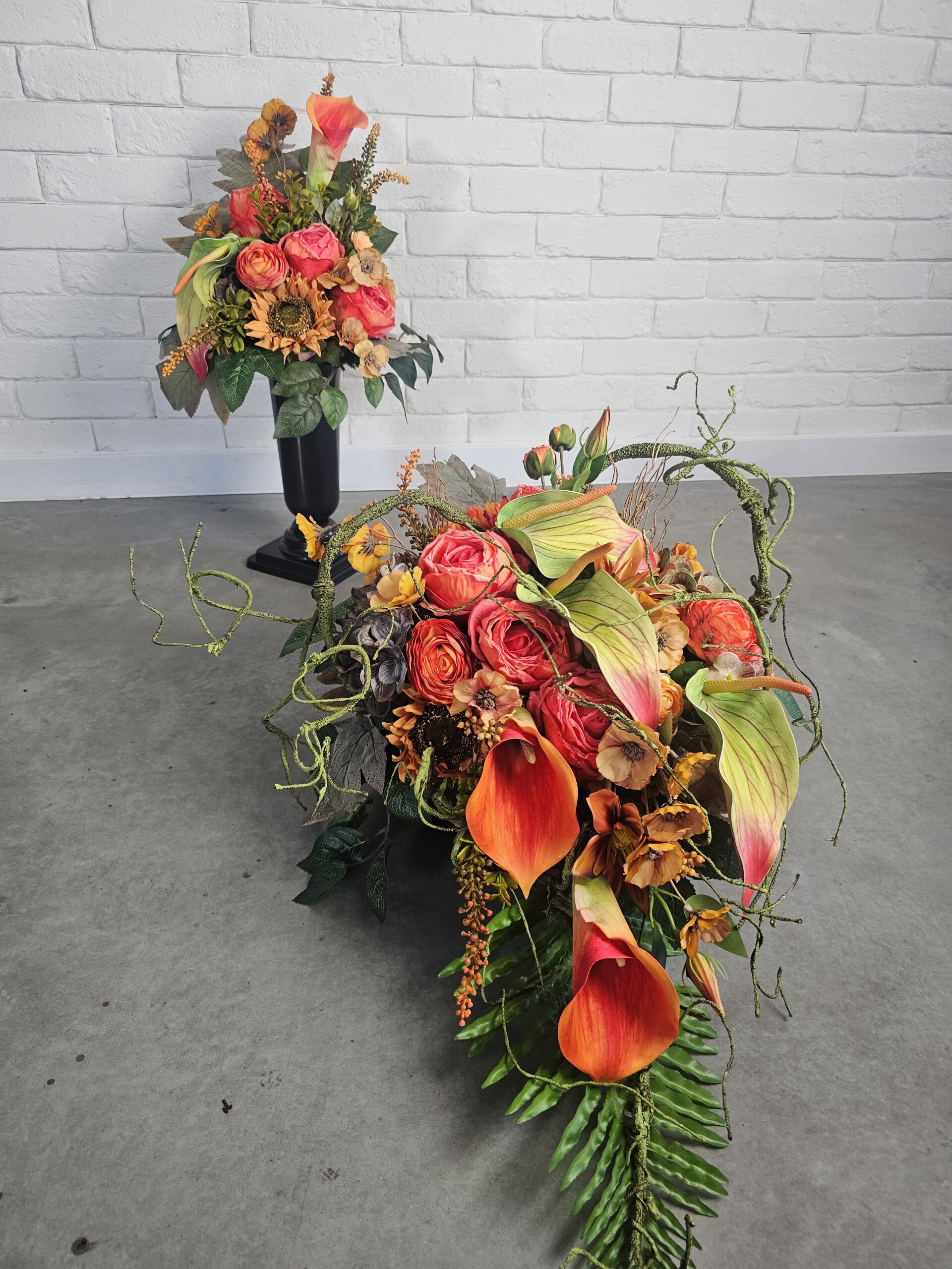 Kompozycja nagrobna obciążona z pomarańczową kalią, jesienne kolory w komplecie tj. wiązanka z bukietem, wymiary: 70cm(długość) x 50cm(szerokość). Wysyłka DPD za przedpłatą 25zł.