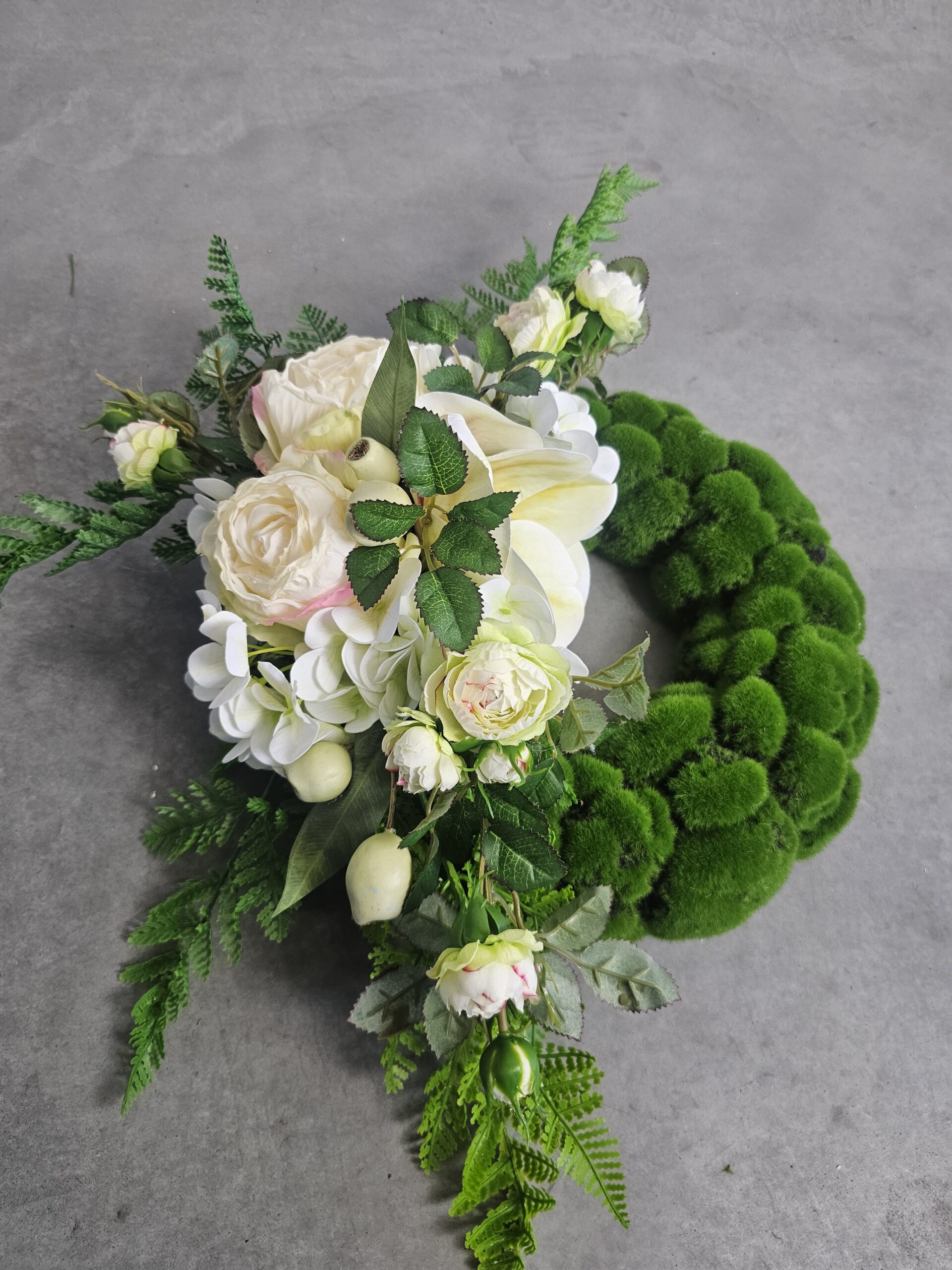 Wianek z białą magnolią i białą różyczką, wymiary: 50cm(długość) x 40cm(szerokość). Wysyłka DPD za przedpłatą 25zł.