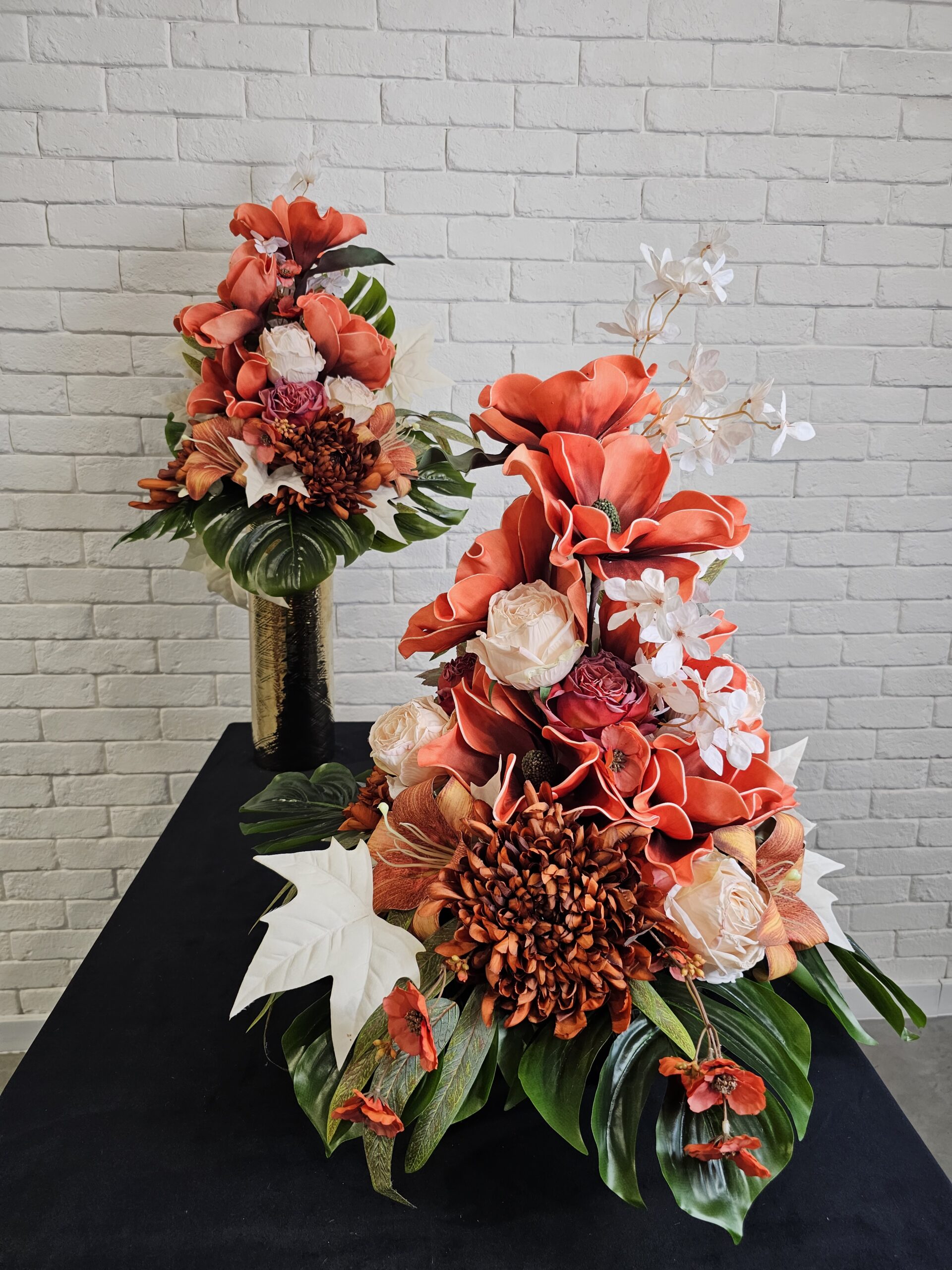 Kompozycja nagrobna obciążona, z rdzawym piankowym kwiatem w komplecie tj. wiązanka z bukietem (rozmiar XL 50cm), wymiary: 50cm(długość) x 40cm(szerokość) x 50cm(wysokość). Wysyłka DPD za przedpłatą 25zł.